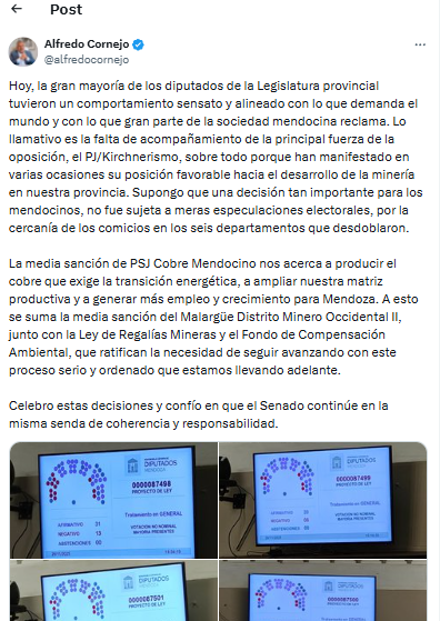 “Hoy, la gran mayoría de los diputados de la Legislatura provincial tuvieron un comportamiento sensato y alineado con lo que demanda el mundo y con lo que gran parte de la sociedad mendocina reclama. Lo llamativo es la falta de acompañamiento de la principal fuerza de la oposición, el PJ/Kirchnerismo, sobre todo porque han manifestado en varias ocasiones su posición favorable hacia el desarrollo de la minería en nuestra provincia. Supongo que una decisión tan importante para los mendocinos, no fue sujeta a meras especulaciones electorales, por la cercanía de los comicios en los seis departamentos que desdoblaron. La media sanción de PSJ Cobre Mendocino nos acerca a producir el cobre que exige la transición energética, a ampliar nuestra matriz productiva y a generar más empleo y crecimiento para Mendoza. A esto se suma la media sanción del Malargüe Distrito Minero Occidental II, junto con la Ley de Regalías Mineras y el Fondo de Compensación Ambiental, que ratifican la necesidad de seguir avanzando con este proceso serio y ordenado que estamos llevando adelante. Celebro estas decisiones y confío en que el Senado continúe en la misma senda de coherencia y responsabilidad“, señaló en X el gobernador de Mendoza.